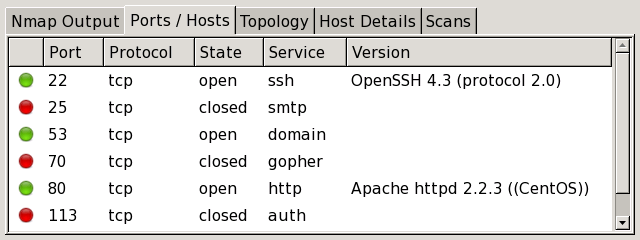 Each scan window contains five tabs which each display different aspects of the scan results. They are: “Nmap Output”, “Ports / Hosts”, “Topology”, “Host Details”, and “Scans”. Each of these are discussed in this section.